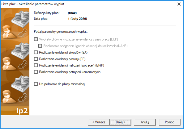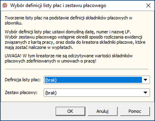 3. W oknie kreatora naliczania wynagrodzeń można wybrać Definicję listy płac i Zestaw płacowy, ale nie jest to konieczne.