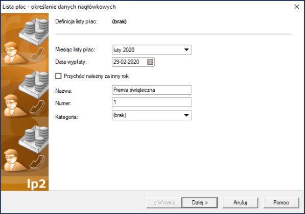 4. W kroku określania danych nagłówkowych należy określić miesiąc, datę wypłaty, nawę oraz numer listy płac.