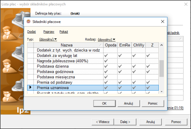 7. Wybrać z listy składnik płacowy lub zdefiniować nowy.