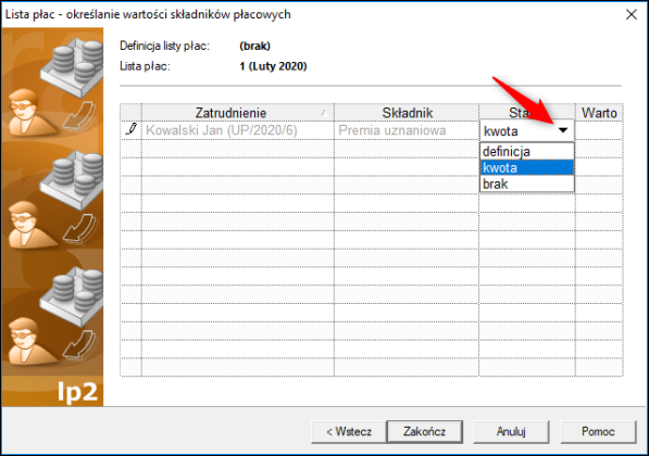 8. Wybrać status naliczenia wartości dla składnika płacowego.