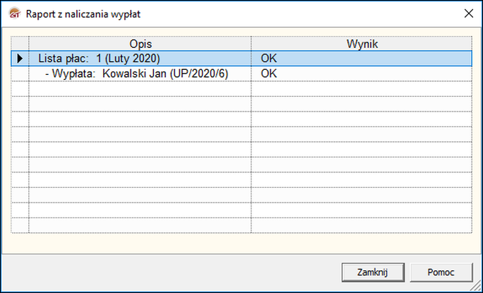 Rezultatem będzie raport potwierdzający poprawne naliczenie listy płac.