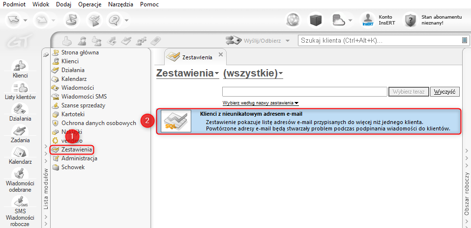 1. Z listy modułów wybrać Zestawienia, a z listy zestawień Klienci z nieunikatowym adresem e-mail.