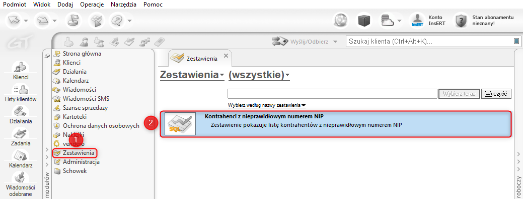 1. Z listy modułów wybrać Zestawienia, a z listy zestawień Kontrahenci z nieprawidłowym numerem NIP.