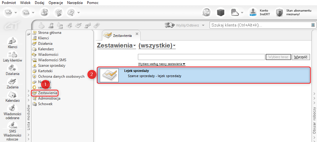 1. Z listy modułów wybrać Zestawienia, a z listy zestawień Lejek sprzedaży.