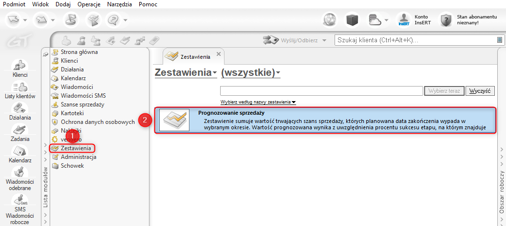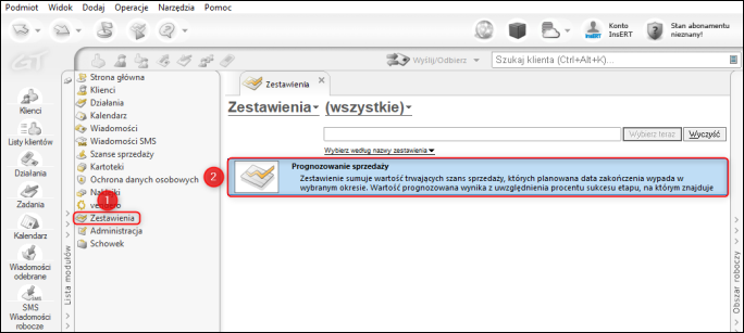 1. Z listy modułów wybrać Zestawienia, a z listy zestawień Prognozowanie sprzedaży.