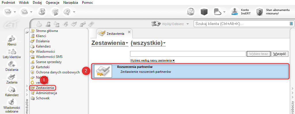 1. Z listy modułów wybrać Zestawienia, a z listy zestawień Rozszerzenia partnerów.