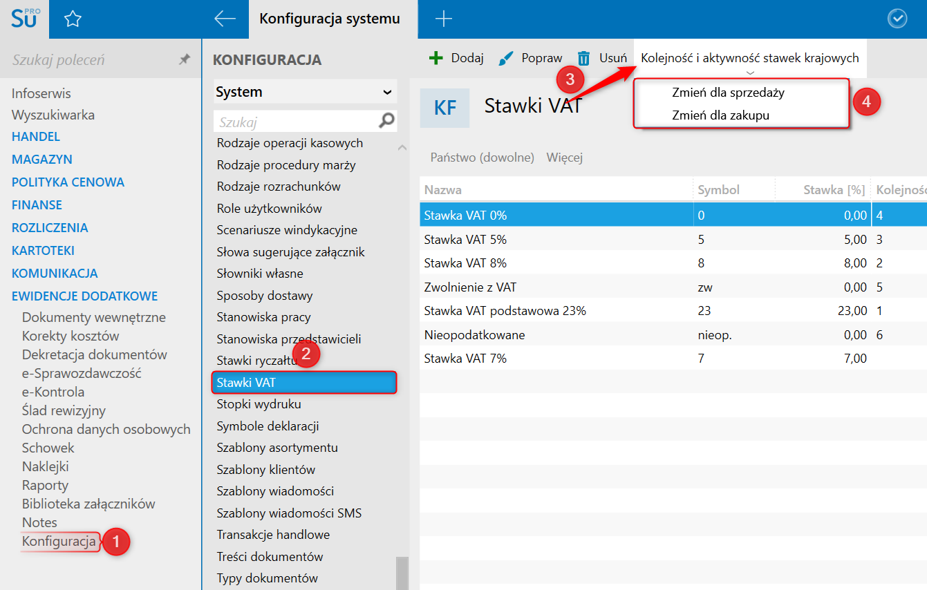 1. Przejść do modułu Konfiguracja – Stawki VAT, następnie kliknąć górne menu Kolejność i aktywność stawek krajowych – Zmień dla sprzedaży/zakupu.