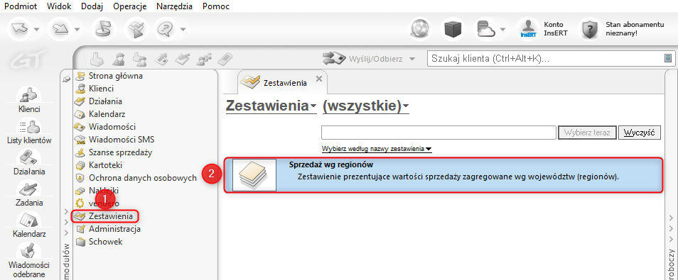 1. Z listy modułów wybrać Zestawienia, a z listy zestawień Sprzedaż wg regionów.