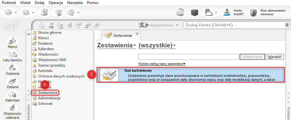 1. Z listy modułów wybrać Zestawienia, a z listy zestawień Ślad kartotekowy.
