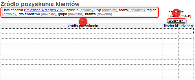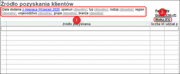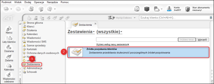 1. Z listy modułów wybrać Zestawienia, a z listy zestawień Źródła pozyskania klientów.