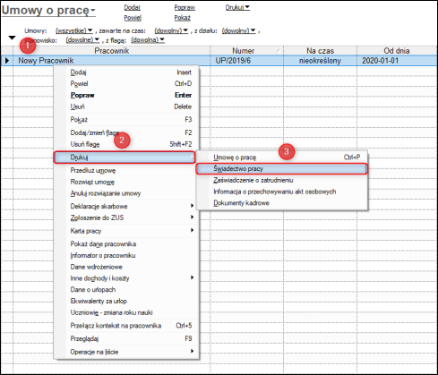 1. Z listy modułów należy wybrać Kadry – Umowy o pracę. Zaznaczyć umowę pracownika, dla którego ma zostać wydrukowane świadectwo pracy, a następnie kliknąć go prawym przyciskiem myszy i wybrać Drukuj – Świadectwo pracy.