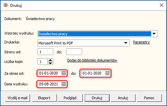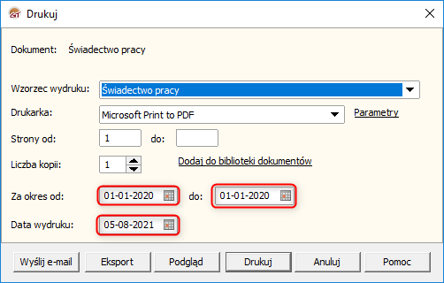 2. W okienku wydruku należy określić okres, który ma obejmować świadectwo pracy oraz datę wydruku.