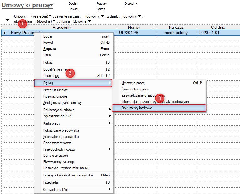 3. Jeśli chcemy jednorazowo ręcznie skorygować treść świadectwa pracy, wybieramy opcję Drukuj – Dokumenty kadrowe.