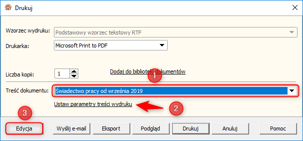 4. W okienku wydruku należy wybrać odpowiedni dokument, kliknąć Parametry treści wydruku i również określić wcześniej wspomniany okres i datę wydruku, a następnie kliknąć przycisk Edycja.