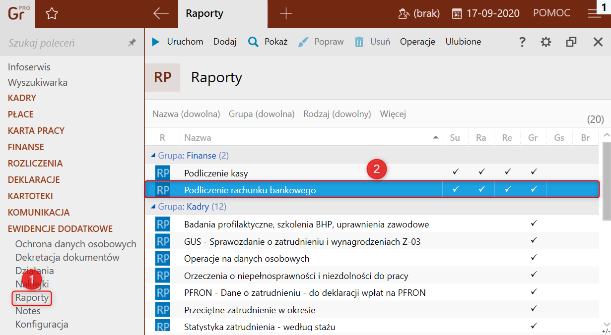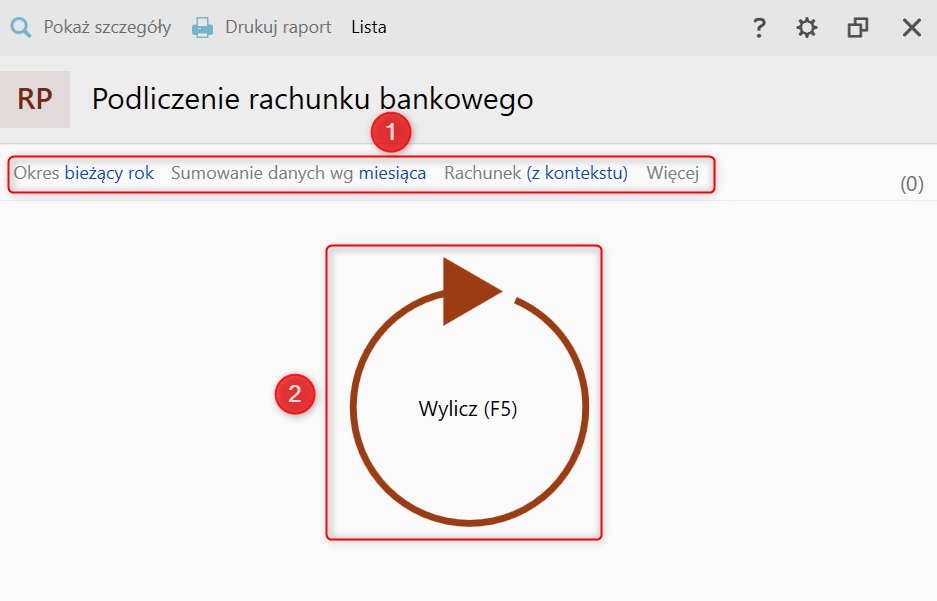 1. Z listy modułów wybrać Ewidencje dodatkowe – Raporty, a z listy raportów Podliczenie rachunku bankowego.