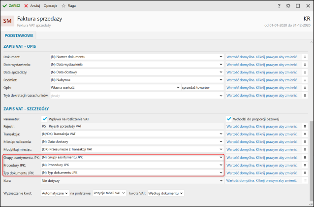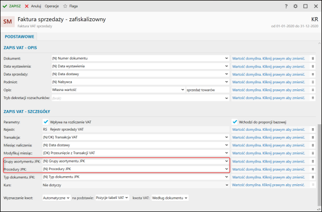 - W sekcji Zapis VAT – szczegóły wskazać Grupę asortymentu JPK oraz Procedurę JPK (Fot. 2),