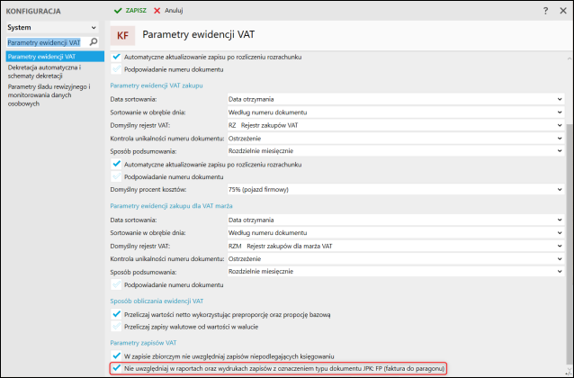 2. Dla zafiskalizowanych faktur sprzedaży posiadających oznaczenie FP, które będą importowane zarówno do ewidencji VAT jak i tworzony będzie zapis księgowy, należy upewnić się, iż w Parametrach ewidencji VAT zaznaczony jest znacznik Nie uwzględniaj w raportach oraz wydrukach zapisów z oznaczeniem typu dokumentu JPK: FP (faktura do paragonu).