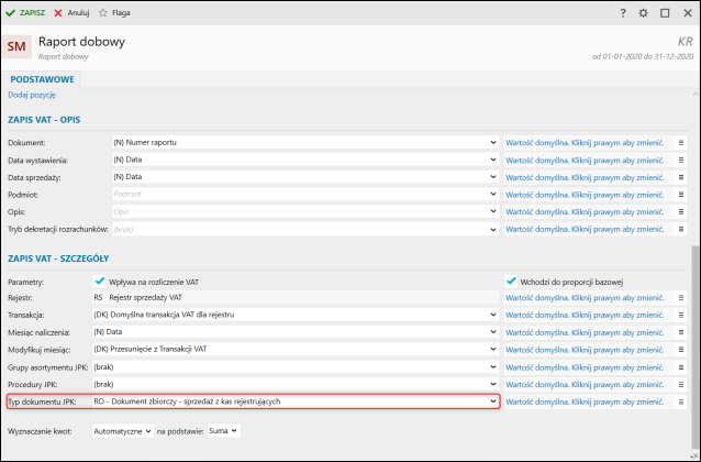 - Parametr Typ dokumentu JPK ustawić na RO – Dokument zbiorczy – sprzedaż z kas rejestrujących,