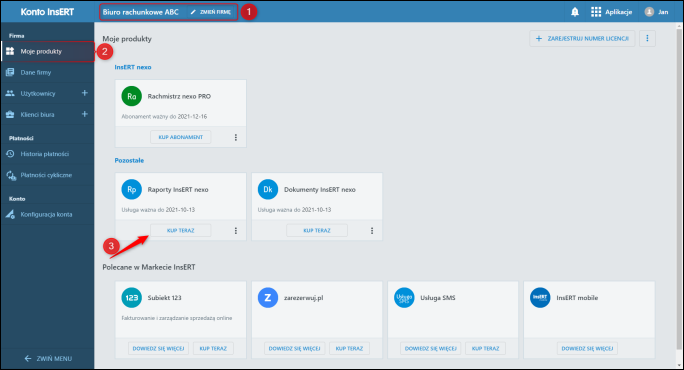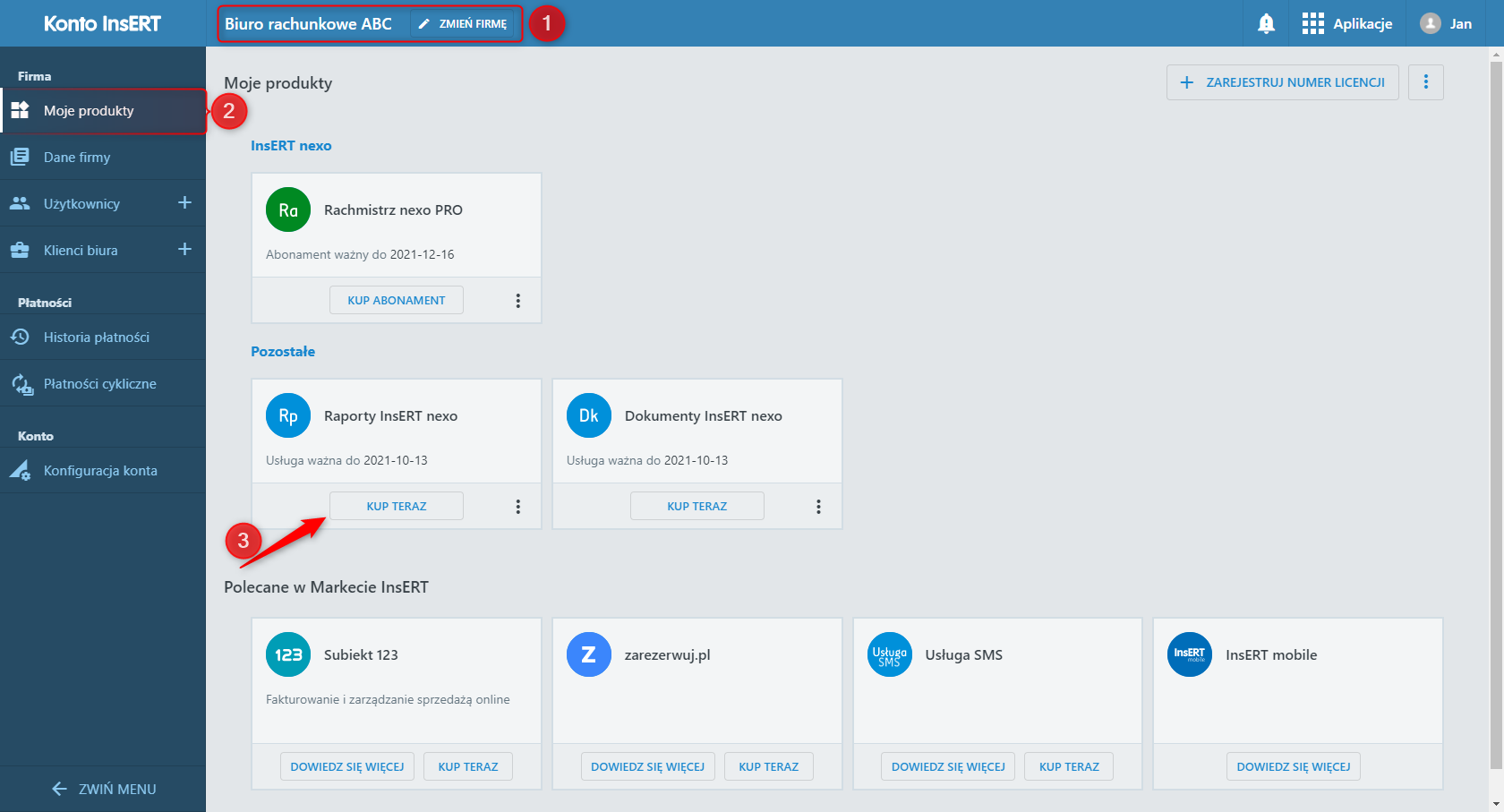 2. Upewnić się, że wybrana jest odpowiednia firma, w razie konieczności Zmienić firmę, następnie na zakładce Moje produkty odnaleźć Raporty InsERT nexo lub Raporty InsERT GT i kliknąć Kup teraz.