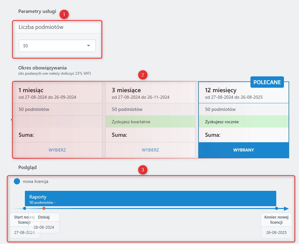 3. Wybrać maksymalną Liczbę podmiotów, dla których będzie można korzystać z usługi Raporty oraz określić Okres obowiązywania. W sekcji Podgląd widoczny będzie Początek aktualnej licencji, a także Początek i Koniec nowej licencji.