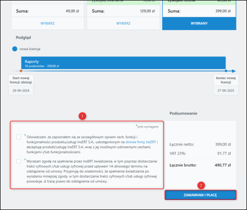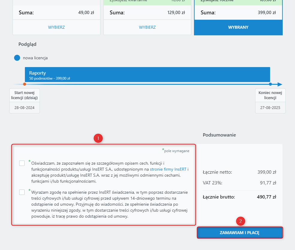 4. Wyrazić zgodę na rozpoczęcie świadczenia i kliknąć Zamawiam i płacę.