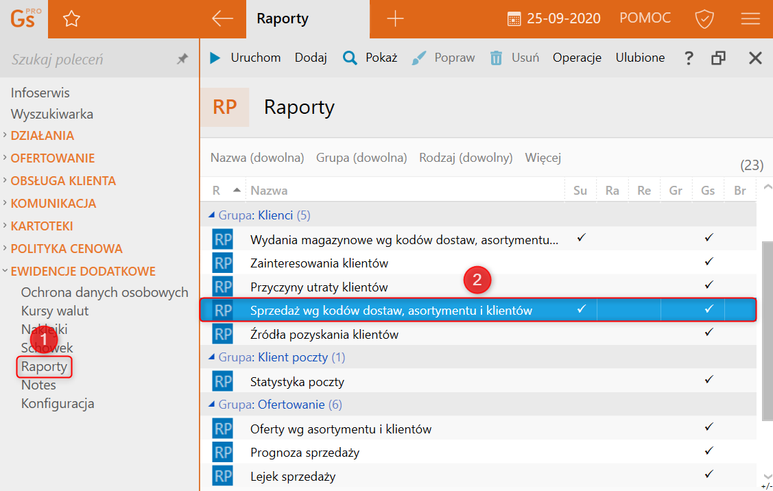 1. Z listy modułów wybrać Ewidencje dodatkowe – Raporty, a z listy raportów Sprzedaż wg kodów dostaw, asortymentu i klientów.