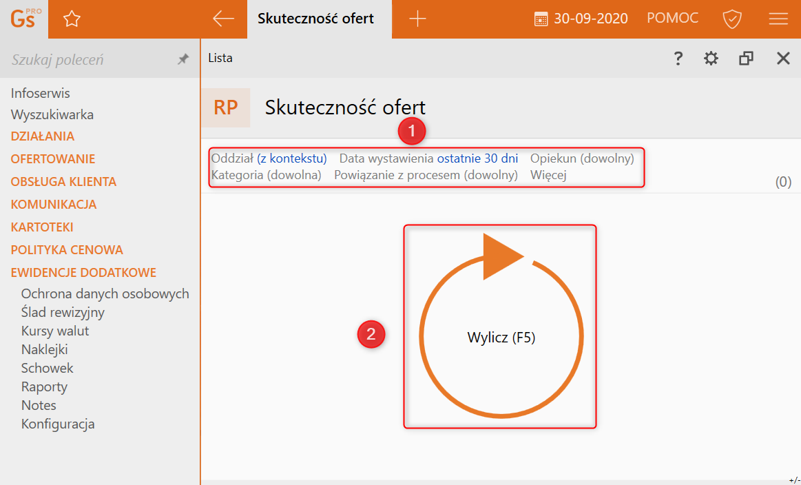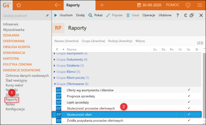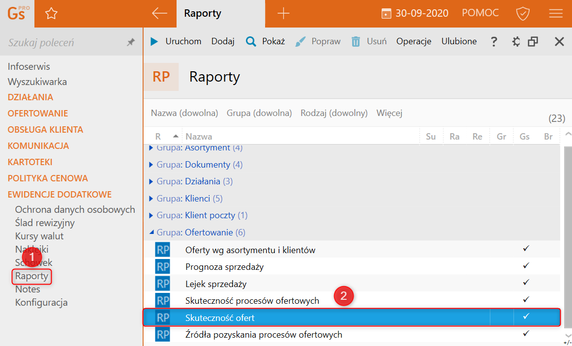 1. Z listy modułów wybrać Ewidencje dodatkowe – Raporty, a z listy raportów Skuteczność ofert.