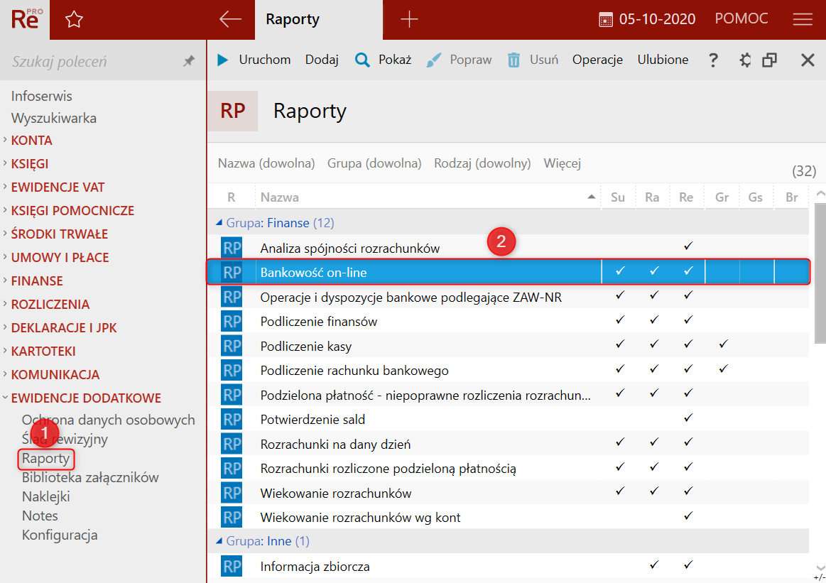 1. Z listy modułów wybrać Ewidencje dodatkowe – Raporty, a z listy raportów Bankowość on-line.
