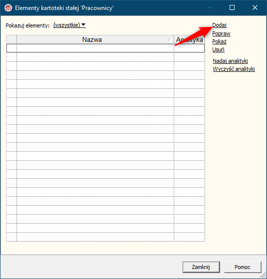 Wybierając funkcję Elementy kartoteki, można wyświetlić listę elementów zawartych w danej kartotece. Użytkownik ma możliwość dodania nowego elementu, edycji jego danych, usunięcia wybranego elementu oraz nadania lub usunięcia numerów analityk wybranym pozycjom. Aby dodać nowego pracownika do kartoteki, należy: