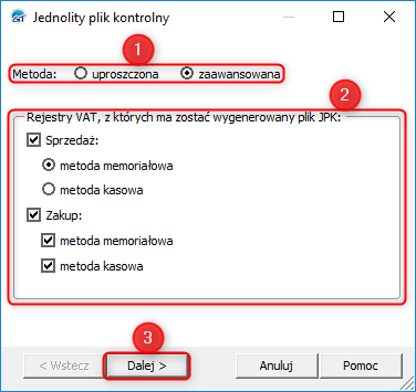 • Zaawansowana – podczas generowania użytkownik ustawia parametry, na podstawie których zostanie wygenerowany plik JPK_V7M. Przy wyborze tej opcji w pierwszej kolejności należy zaznaczyć rejestry VAT, z których będzie generowany plik.