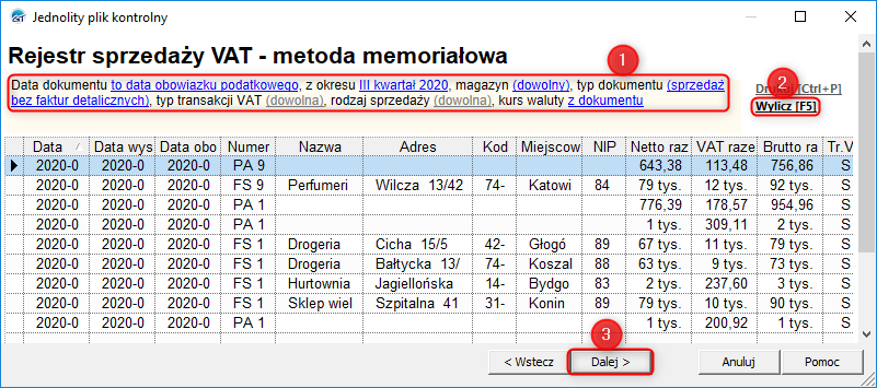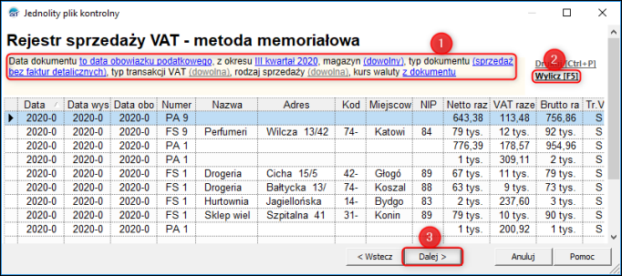 3. Jeżeli w poprzednim kroku została wybrana metoda zaawansowana (w przypadku metody uproszczonej można pominąć ten krok), należy ustawić parametry, na podstawie których zostaną dodane dokumenty do pliku JPK. Każdorazowo, po zmianie parametrów znajdujących się nad tabelą, należy kliknąć przycisk Wylicz. Po wyliczeniu w tabeli będą widoczne dokumenty, które będą dodane do pliku JPK_V7M. Jeżeli wszystkie dokumenty zostały wczytane poprawnie, to można przejść Dalej. W ten sposób należy wyliczyć dane dla wszystkich rejestrów zaznaczonych w poprzednim kroku.