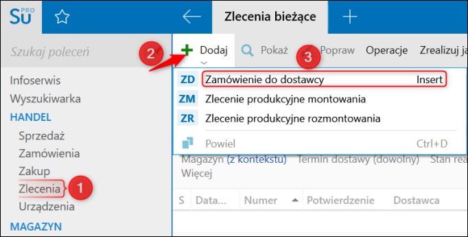 1. Przejść do modułu Handel – Zlecenia, a następnie z menu wybrać Dodaj – Zamówienie do dostawcy.