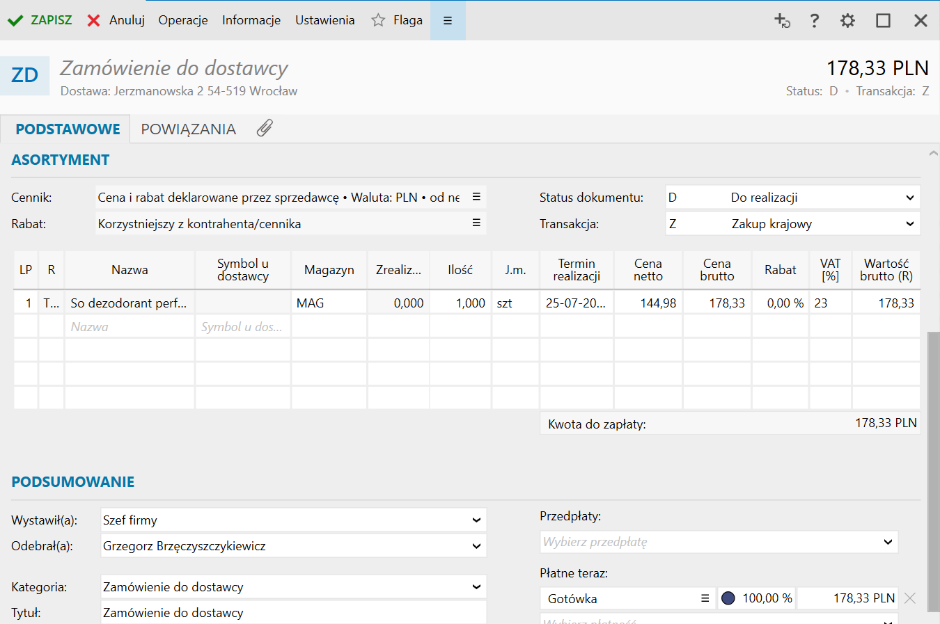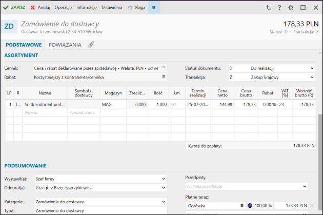 2. W nowym oknie wprowadzić wszystkie dane do zamówienia (dostawcę, asortyment, itd.). Dodatkowo użytkownik może wybrać preferowaną formę płatności, która zostanie przeniesiona na fakturę, jeżeli zostanie ona wystawiona na podstawie zamówienia.