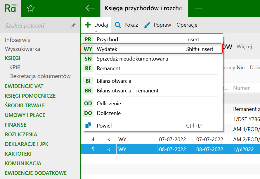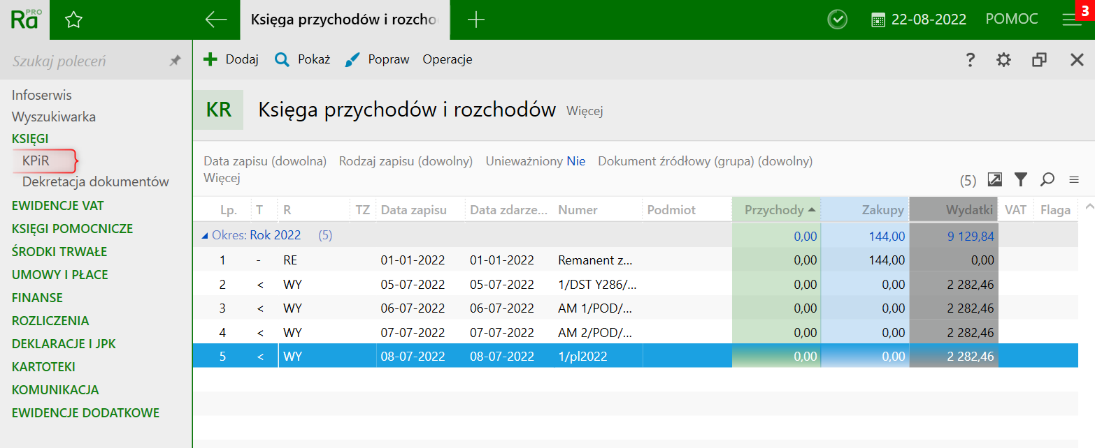 1. Przejść do modułu KPiR.