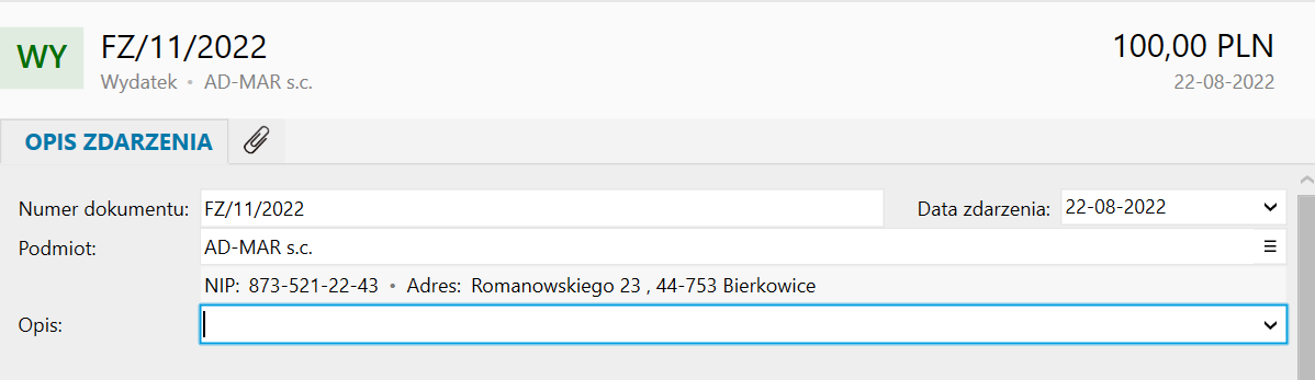 3. W sekcji Opis zdarzenia należy wprowadzić dane dotyczące ewidencjonowanej operacji gospodarczej, które wymagane są rozporządzeniem w sprawie prowadzenia KPiR. Są to m.in.: