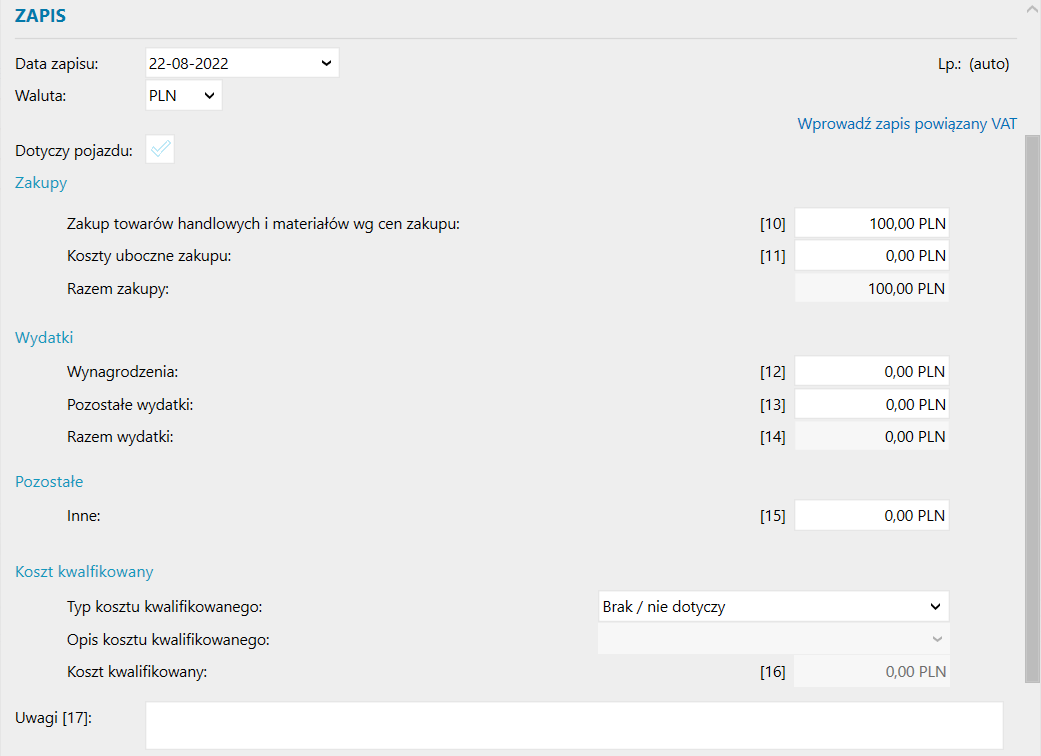Dotyczy pojazdu – pole związane z ewidencjonowaniem wydatków na eksploatację pojazdów (np. zakup paliwa). Jego zakreślenie uaktywni dodatkowe pola pozwalające na określenie wartości wydatku i wybrania sposobu ujmowania go w koszty.