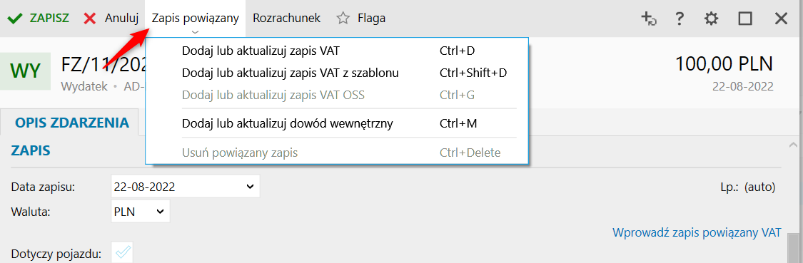 5. Po naciśnięciu klawiszy Ctrl+D lub z górnego menu Zapis powiązany można wywołać zakładkę VAT, która umożliwia wprowadzenie zapisu powiązanego VAT.