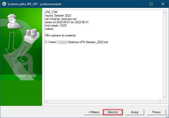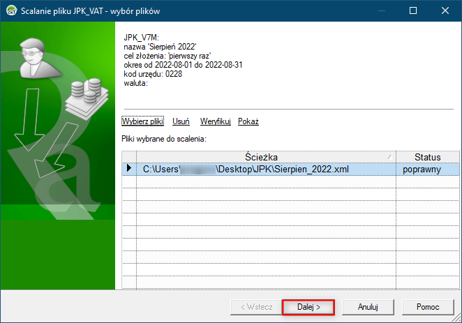 5. Po kliknięciu Zakończ program dokona scalenia plików z istniejącym plikiem JPK, a następnie wyświetli jego zawartość.