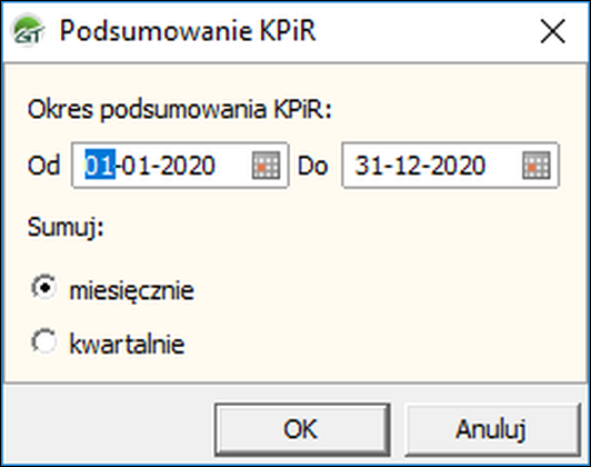 3. W oknie Podsumowanie KPiR określić okres wydruku oraz sumowanie.