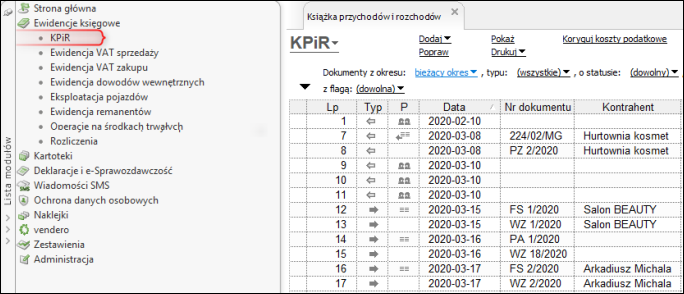 1. Przejść do modułu Ewidencje księgoweKPiR.