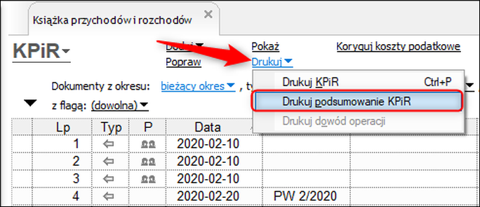 2. Wybrać z górnego menu DrukujDrukuj podsumowanie KPiR.