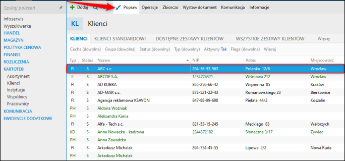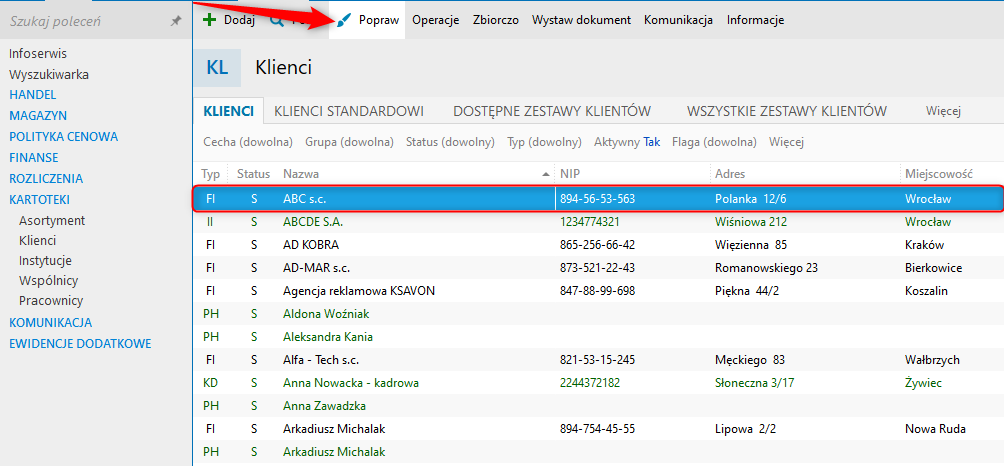 1. Przejść do modułu Kartoteki – Klienci, zaznaczyć odpowiednią kartotekę i kliknąć Popraw.