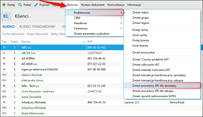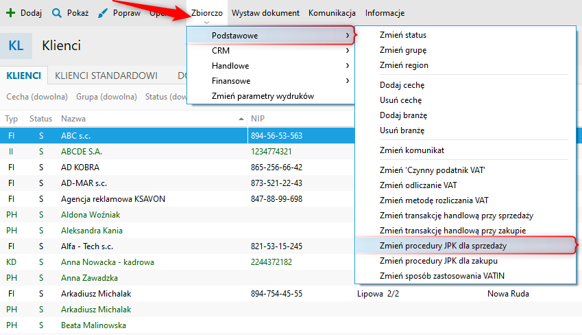 Dodatkowo operację można przeprowadzić dla wielu kartotek jednocześnie, zaznaczając klientów z listy, a następnie wybierając z górnego menu Zbiorczo – Podstawowe – Zmień procedury JPK dla sprzedaży.