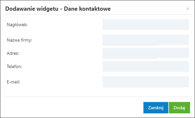 W oknie dodawania zdefiniować parametry widgetu m.in. Nagłówek, Nazwa firmy, Adres, Telefon i adres e-mail.