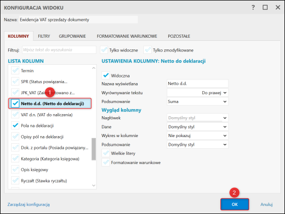 2. Zaznaczyć kolumnę Nett​o d.d. (Netto do deklaracji) i ​zatwierdzić przyciskiem OK.​