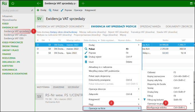 Aby dodać kolumnę VAT do naliczenia w ewidencji VAT sprzedaży, należy kliknąć prawym przyciskiem myszy na dowolną kolumnę, a następnie wybrać Operacje na liście – Konfiguracja widoku.