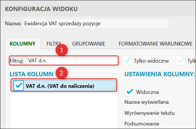 W nowym oknie po zaznaczeniu kolumny VAT d.n. (VAT do naliczenia) kliknąć OK.
