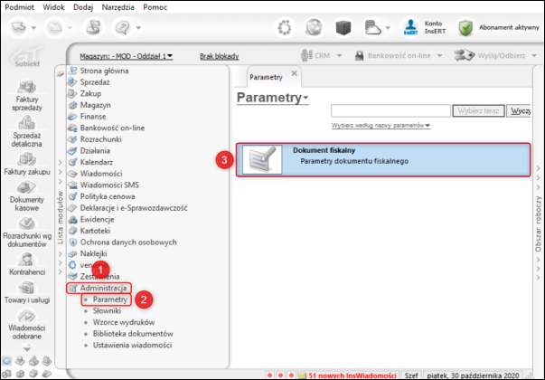 1. Z listy modułów wybrać Administracja – Parametry, a z listy parametrów Dokument fiskalny.