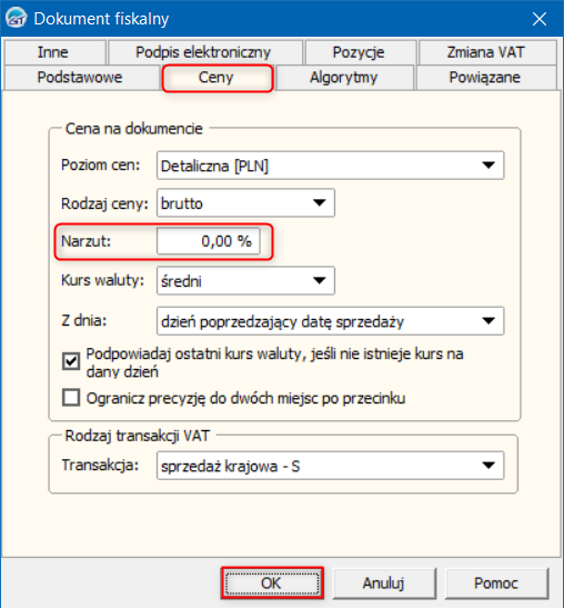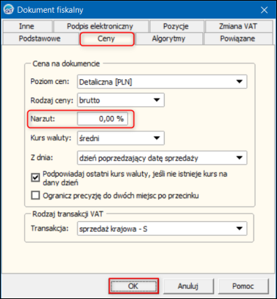 2. W oknie Dokument fiskalny przejść na zakładkę Ceny i wprowadzić domyślny Narzut. Zmiany zapisać przyciskiem OK.