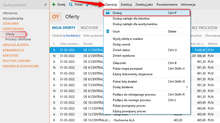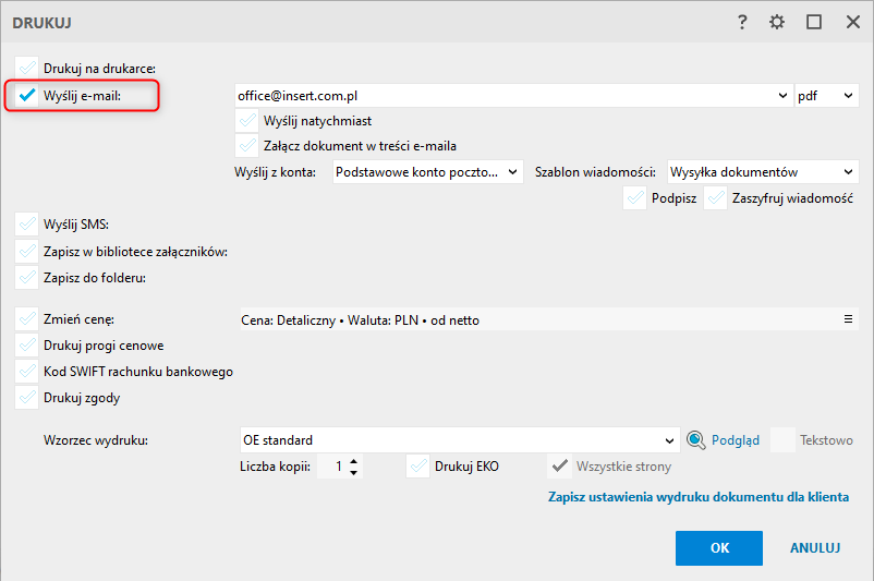 1. Poprzez wydruk oferty jeżeli użytkownik utworzył w programie szablony wiadomości e-mail. W tym wypadku należy rozwinąć menu Operacje – Drukuj aktualną ofertę. Następnie zaznaczyć opcję Wyślij e-mail i wskazać szablon wiadomości.